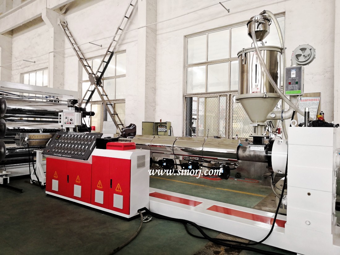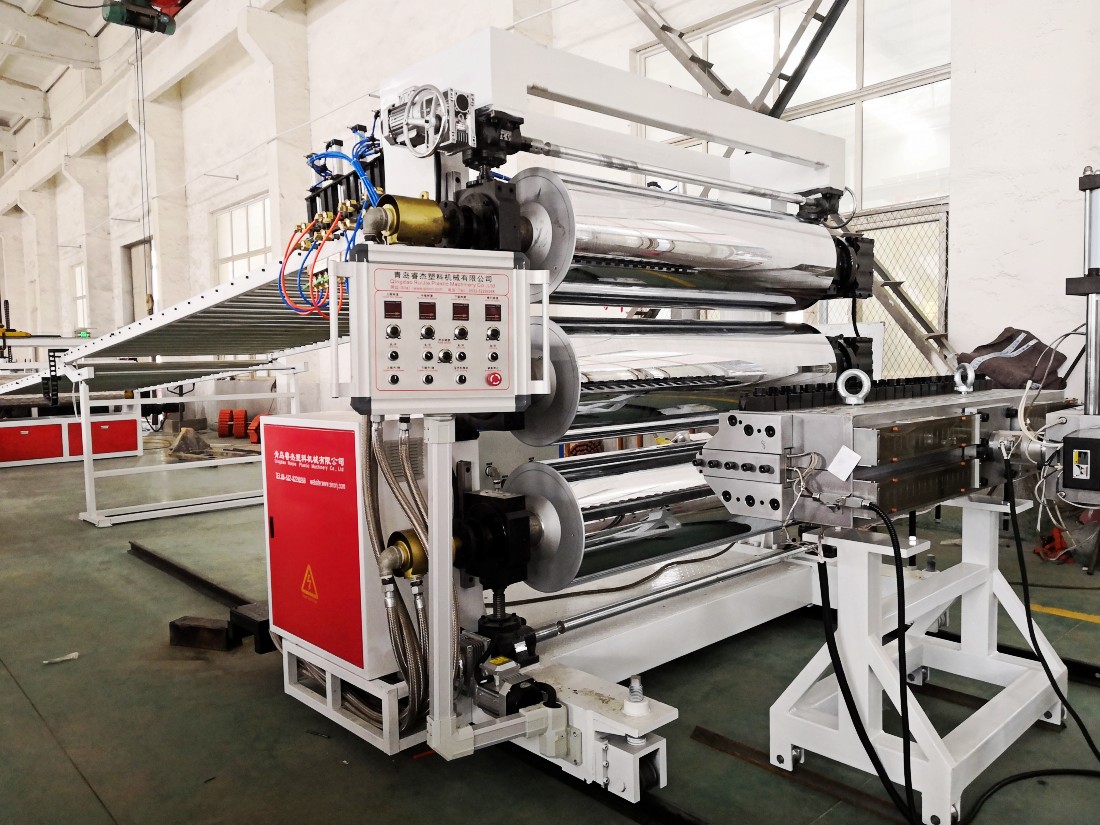 單螺桿擠出機,衣架式模具,三輥壓光機,冷卻托架,牽引機,剪板機,橫向切割機,收卷機和其他輔助機械組成。